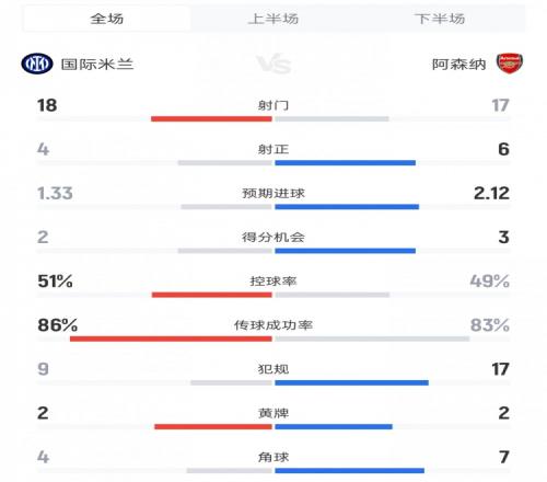 国米vs阿森纳全场数据:射门18比17、射正4比6、犯规9比17